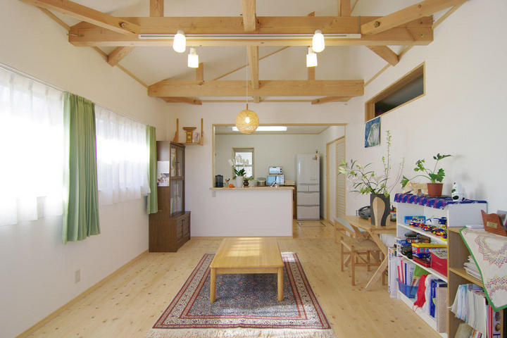 | No.29 | 鎌ヶ谷の家 | 座卓スタイルの12帖大リビング。勾配天井は小屋梁現わし。隣室への通風と採光のための壁開口部も設けました。 |