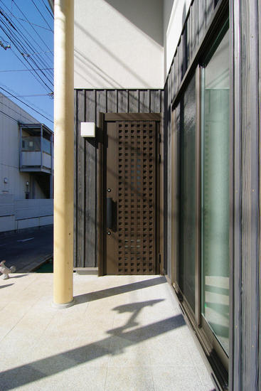 | No.34 | さいたま・緑区の家 | 玄関ドアはナチュラルな木目調アルミ断熱ドア。外壁に調和した黒茶の格子柄デザインを採用。 |