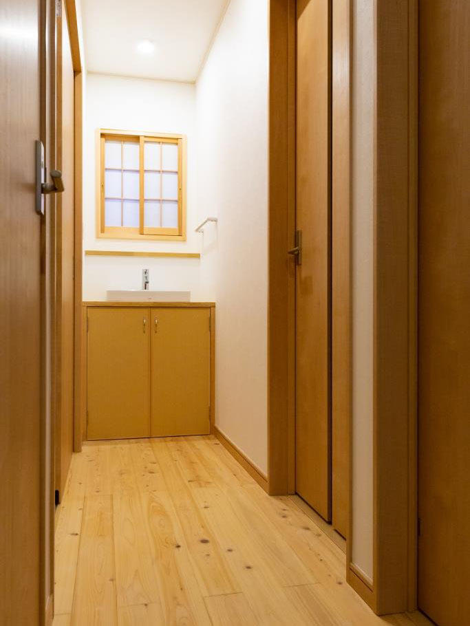 | No.46 | 大黒柱のある和モダンな家 | 廊下の奥の和風意匠の手洗いが雰囲気をつくる。 |