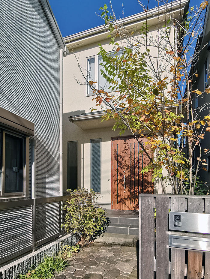 | No.47 | 弦巻の家 | 「旗竿地」に建つシンプルな佇まい。延べ段を思わせる自然石の埋め込みと雑木庭が住まい方を予感させるアプローチに。 |