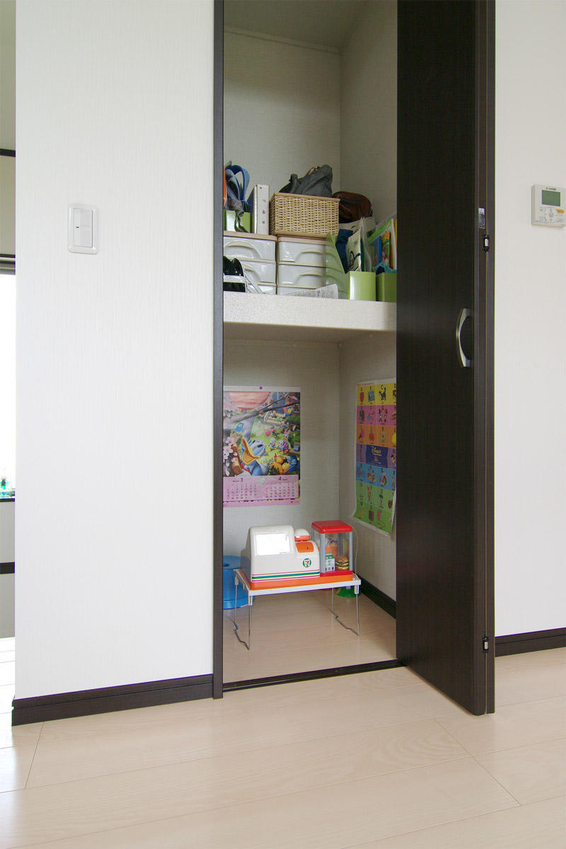 私としては収納が充実していることが何よりうれしいですね。テレビの左右の壁の後ろにも収納棚があるなんて、言わなければ誰にも気付かれません。階段脇のリビング物入れも、取り急ぎ入れなければならない物がないので、下半分は娘のおもちゃ収納庫兼遊び部屋になっています。小さな子供にとっては、押し入れや物入れが自分だけの隠れ家のような特別な場所になる時期ってありますよね。いまちょうど娘にとっては格好の「おままごと部屋」になっていて、キッチンにいても目の届く範囲で遊んでもらえるので大助かりです。